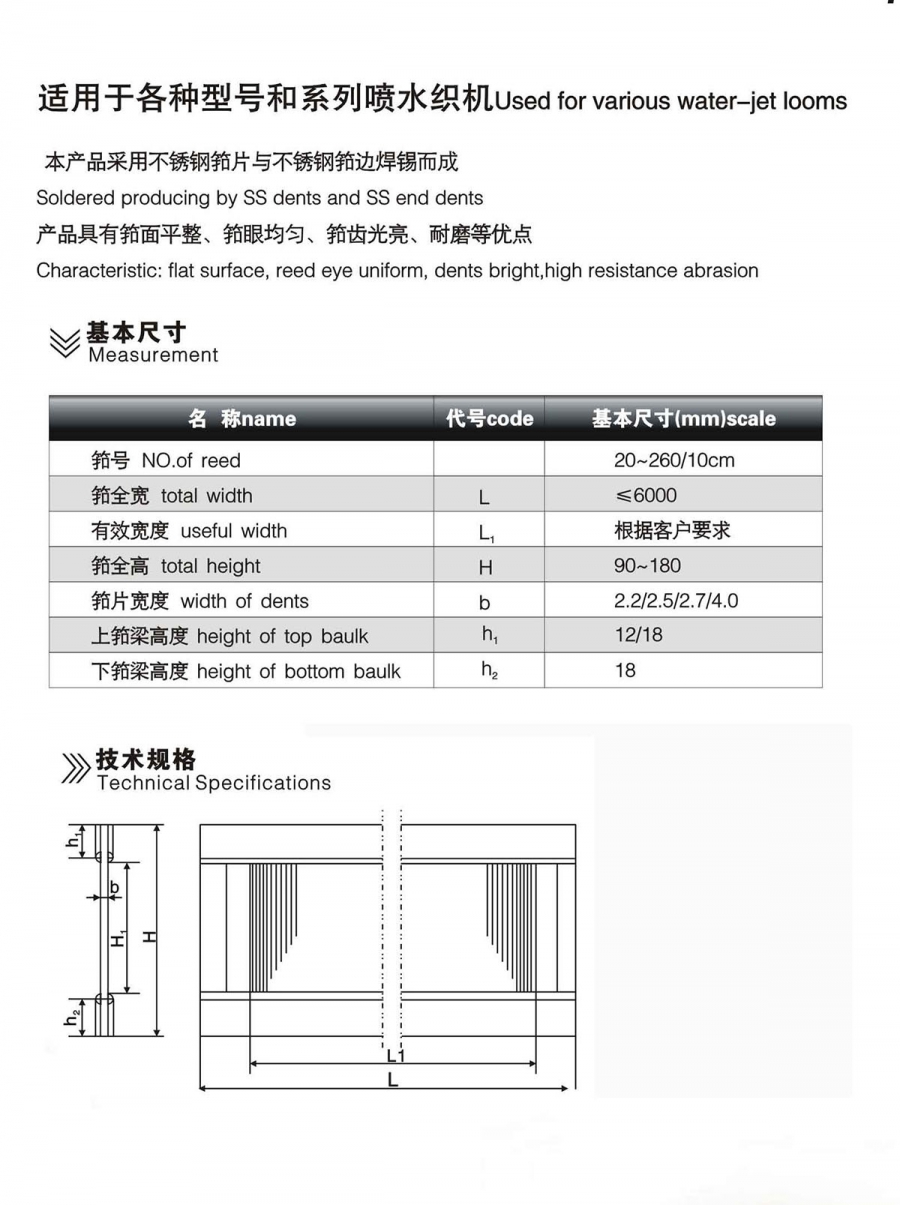 Product description:適用于各種型號和系列的噴水織機(jī)用鋼筘,本產(chǎn)品采用不銹鋼筘片與不銹鋼筘邊粘接而成,產(chǎn)品具有筘面平整、筘眼均勻、筘齒光亮、耐磨等優(yōu)點